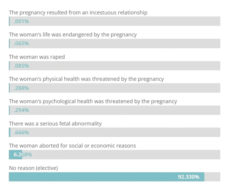 The state of Florida records a reason for every abortion that occurs within its borders each year. In 2015, there were 71,740 abortions in Florida. This table lists each reason and the percentage of abortions that occurred because of it.